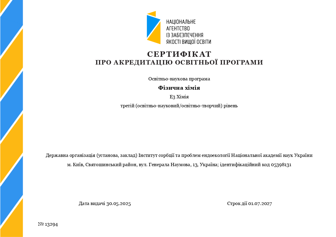 В Інституті сорбції та проблем ендоекології НАН України здійснюється підготовка докторів філософії в галузі знань Природничі науки, математика та статистика за спеціальністю Е3 Хімія за акредитованою освітньо-науковою програмою ” Фізична хімія”.